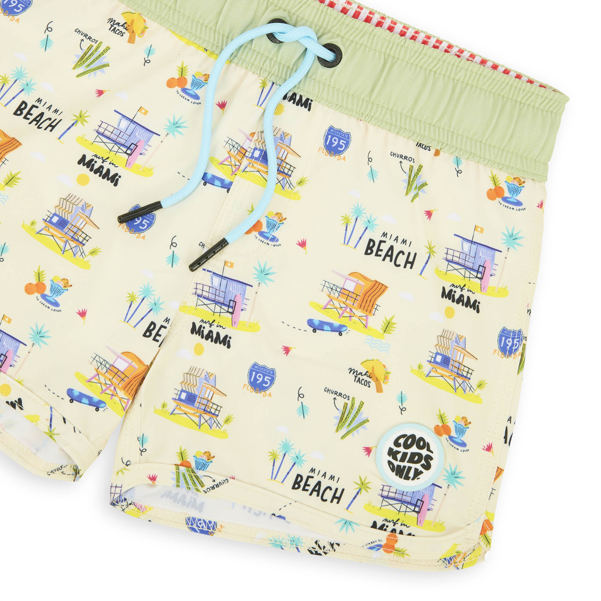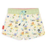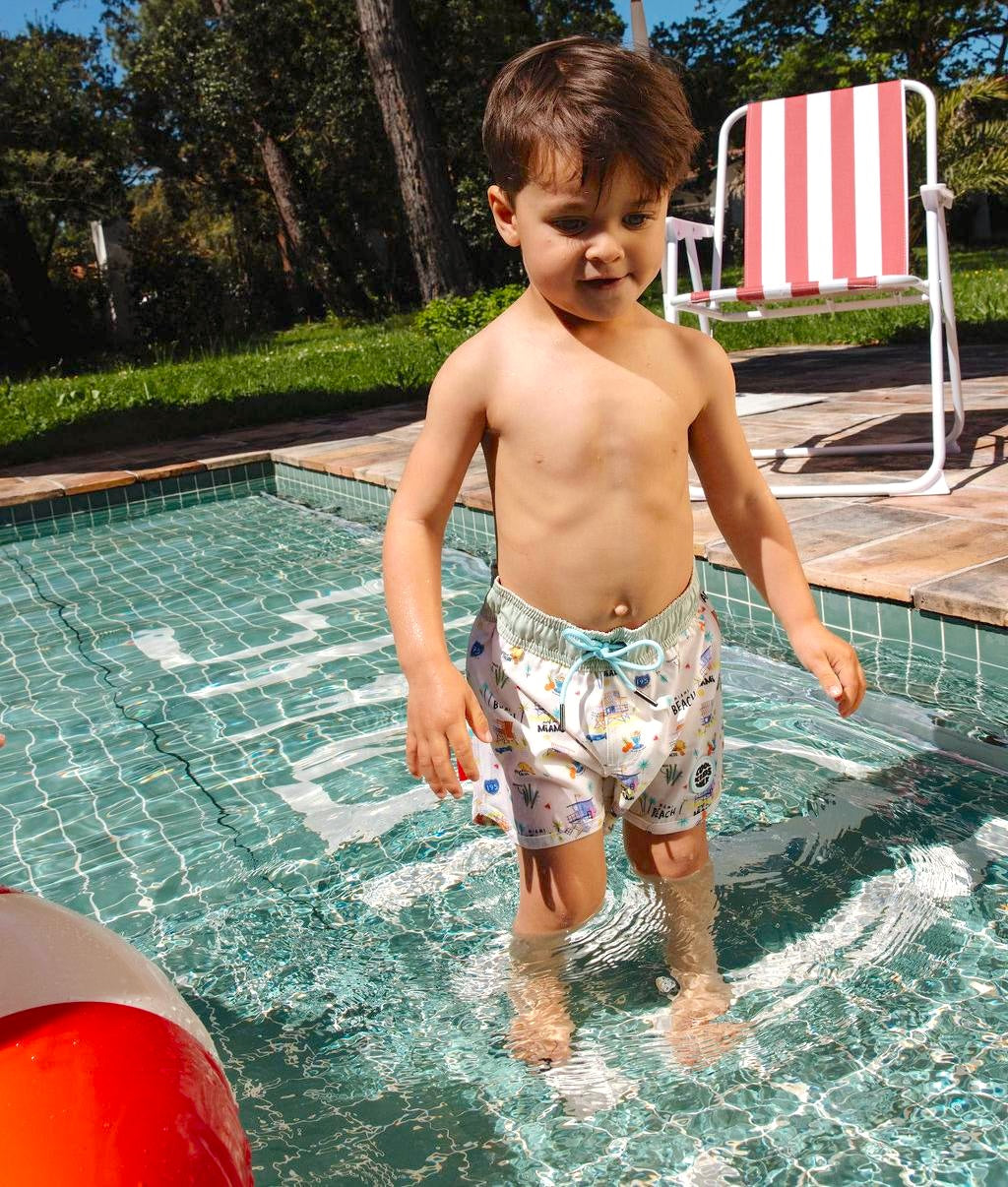 Craquez pour le Maillot de bain pour garçons, Miami Beach. Imprimé inédit, anti-UV, confortable et résistant. Taille élastique avec cordon ajustable, parfait pour les journées plage ou piscine. À matcher avec nos accessoires du même Nom. De 3 à 8 ans.